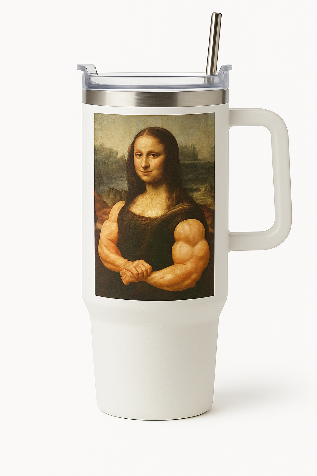 Sip like a legend with the Muscle Lisa Tumbler, where classical art meets modern muscle. Featuring a hilariously buff rendition of da Vinci’s Mona Lisa, this tumbler turns every drink into a masterpiece of confidence and power. Crafted with premium stainless steel, a sleek matte finish, and a double-wall insulated body, it keeps your beverages hot or cold for hours — just like Mona’s timeless smirk.